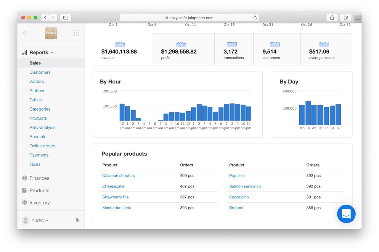Thanks to Poster’s powerful analytics and reporting tools, you will be able to gain a better understanding of the performance of different items on your menu, and decide which ones you want to promote, and which ones you want to get rid of. Simply go, to Reports → Sales, and under Popular Products you will be able to find your best-selling menu items for any given period.