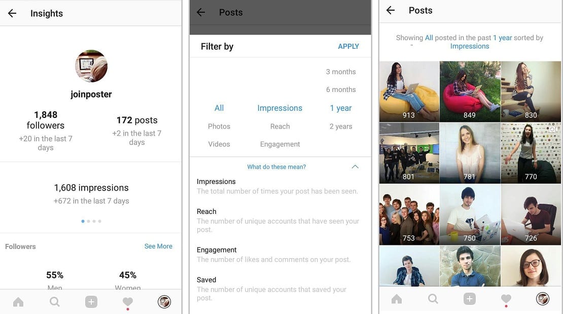 Using the analytics tool, you can track many indicators of your Instagram profile. For example Instagram Insights shows impressions (the number of times your ads were on screen), profile views (the number of unique followers who visited your profile) reach (the number of unique followers who viewed your posts and stories), website clicks (the number of clicks on the link in the profile description), etc. Using Instagram Insights, you can analyze audiences by gender and age, and determine what content they like by coverage, display, and involvement. Analyze what publications are popular, and try to identify patterns.