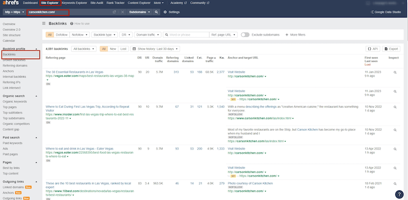 The search operator “keyword + inurl:blog” will help you find relevant blog posts in which you can place links to your website. Now, let’s see how to analyze competitor backlinks in Ahrefs. We took the first website from the list of the best restaurants in Las Vegas.