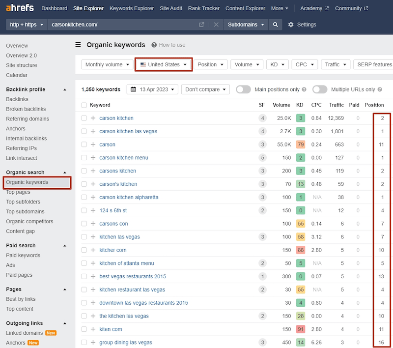 - Ranking by keywords. This metric shows how high you are in SERPs for these or those keywords. You can track in real-time with tools such as SERanking and monitor with Ahrefs. Let’s take the website of the restaurant we have already analyzed for backlinks as an example.