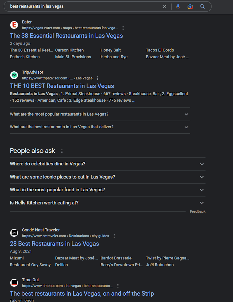 1. Get listed among the best restaurants in your geographical location. This is a good method to get a quality backlink and attract the attention of potential clients. To do that, you should enter a search query “best restaurants in “geographical location””. For instance, we chose Las Vegas.