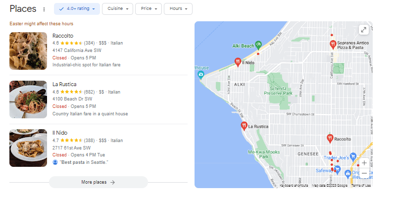 Look at the picture, and you will see that people who wanted to try pasta in Seattle made a search on Google. Google, in a split second, “recommended” restaurants that worked in advance on their SEO indicators. Surely, it also takes into account users’ reviews, the overall rating of a business, and so on. Now imagine that you own a little Italian restaurant where the best chef makes the best pasta, but you also need a high-ranked website to attract potential clients. Otherwise, millions of people will not know about your restaurant and pass by it.