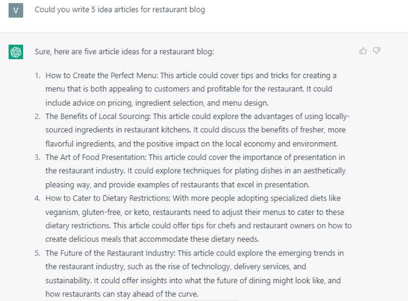 If you find it challenging to start a restaurant blog, you can use ChatGPT. It will give you ideas on where to start. Then you will find your unique style and begin to attract more customers.