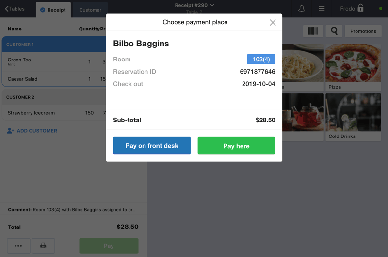 Accept payments via cash or card using the POS app at the counter, or invoice the room and charge guests during their check-out.
