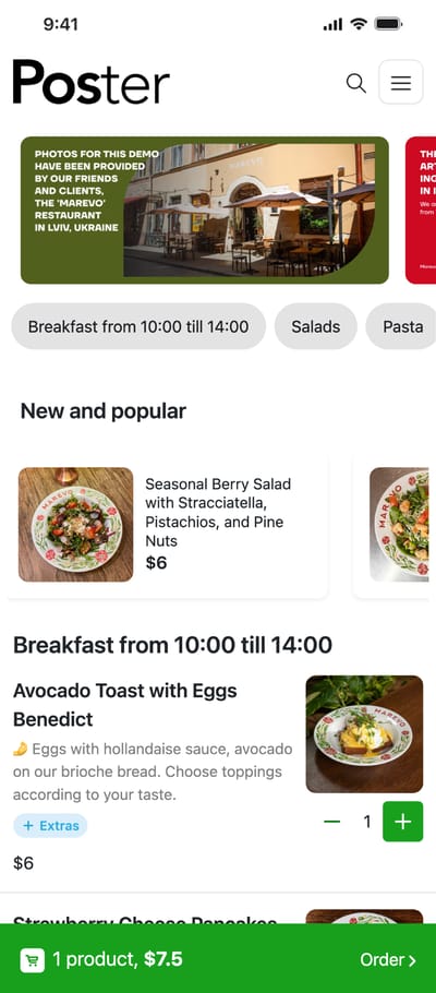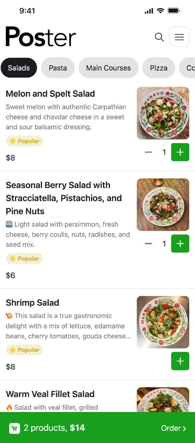 Create a contactless QR menu for your restaurant or cafe with Poster QR. Easy online menu just a QR code away.