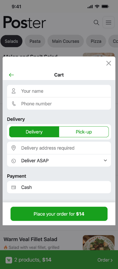 Orders from the website are automatically sent to the Poster terminal, along with all the relevant info, so you won’t lose a single order or customer!