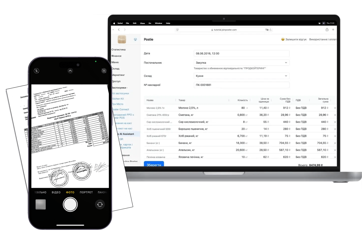 Imagine receiving a delivery with a printed invoice. Instead of typing every item by hand, Postie AI processes it automatically and stores everything in Poster—no extra effort on your side.