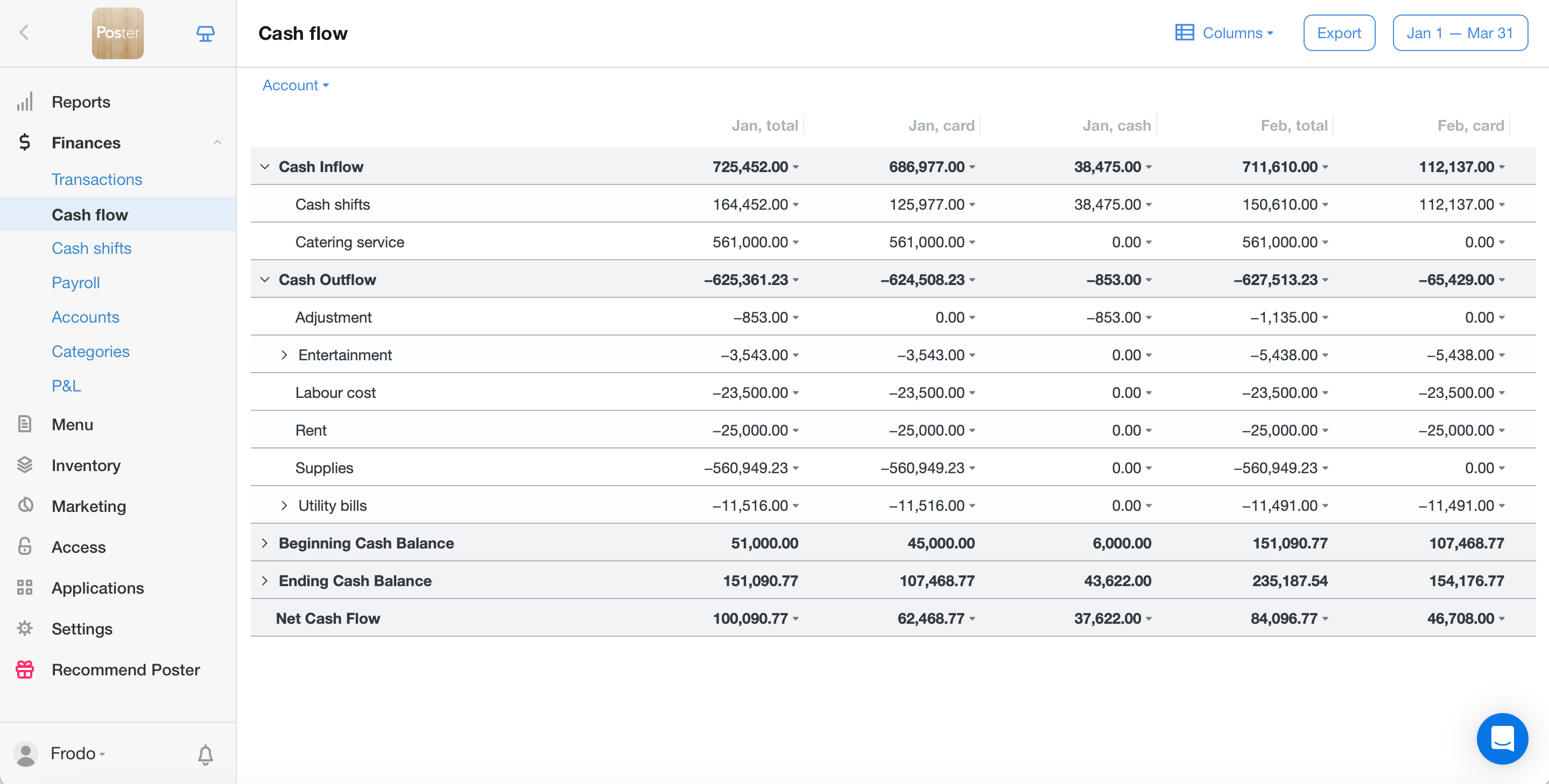 With Poster’s Cash Flow report, you always know where your money is. Check the balance of a specific account or all accounts at your location at the beginning and end of each period. Manage risks effectively: prevent cash flow gaps and plan for business expansion.
