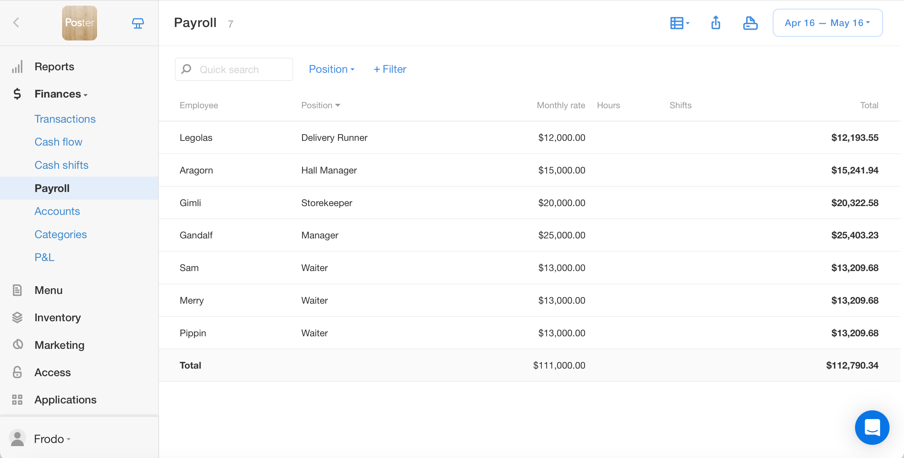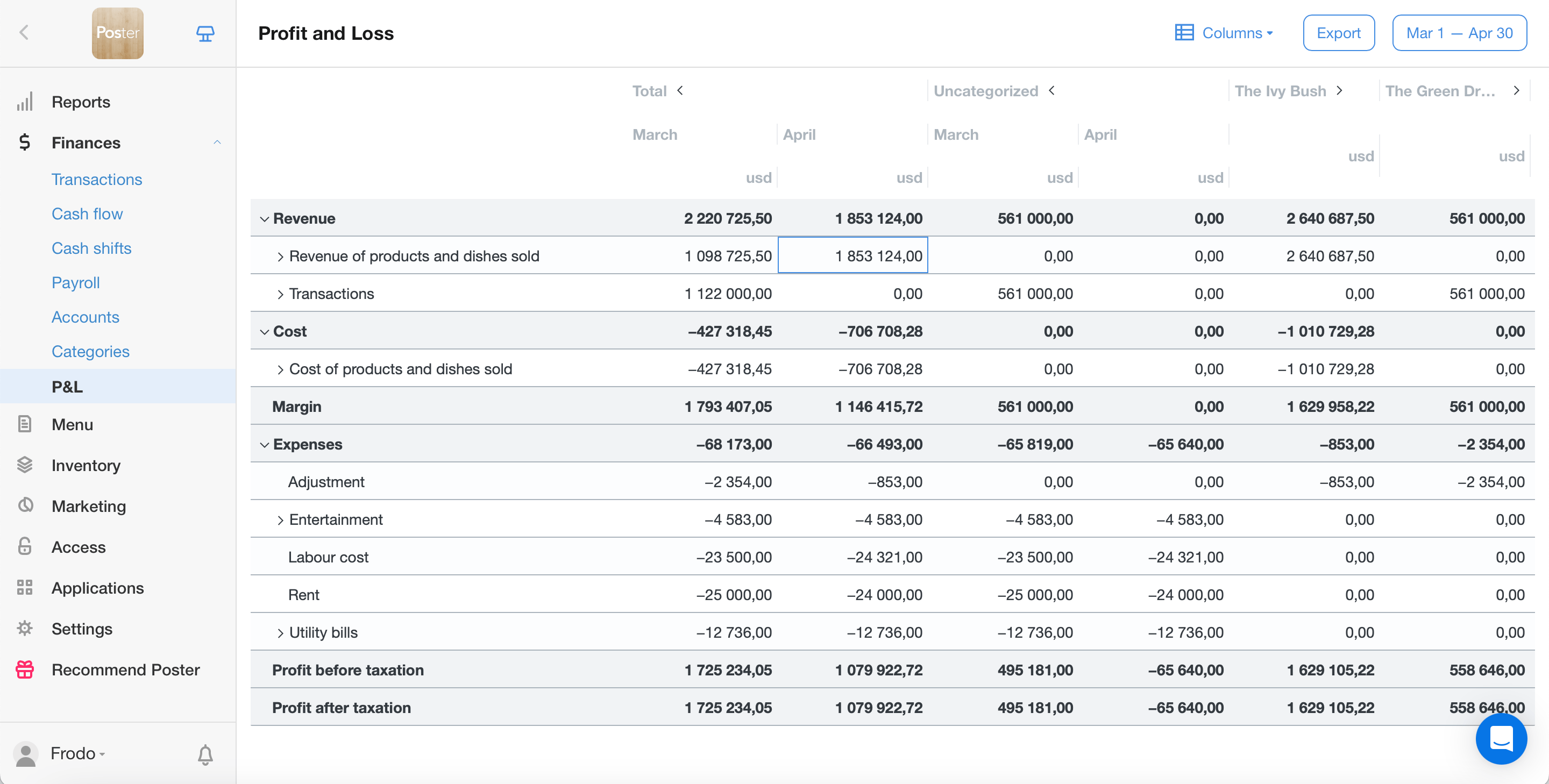 With Poster you’ll easily find any figure in your operations. For example, the net profit for the previous quarter or how much you spent on salaries in March last year.