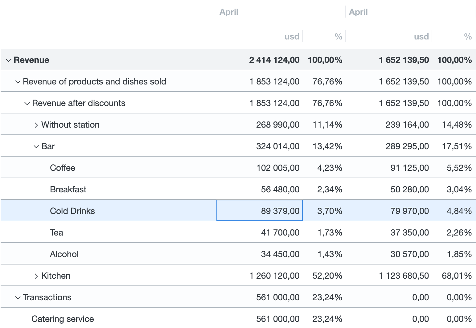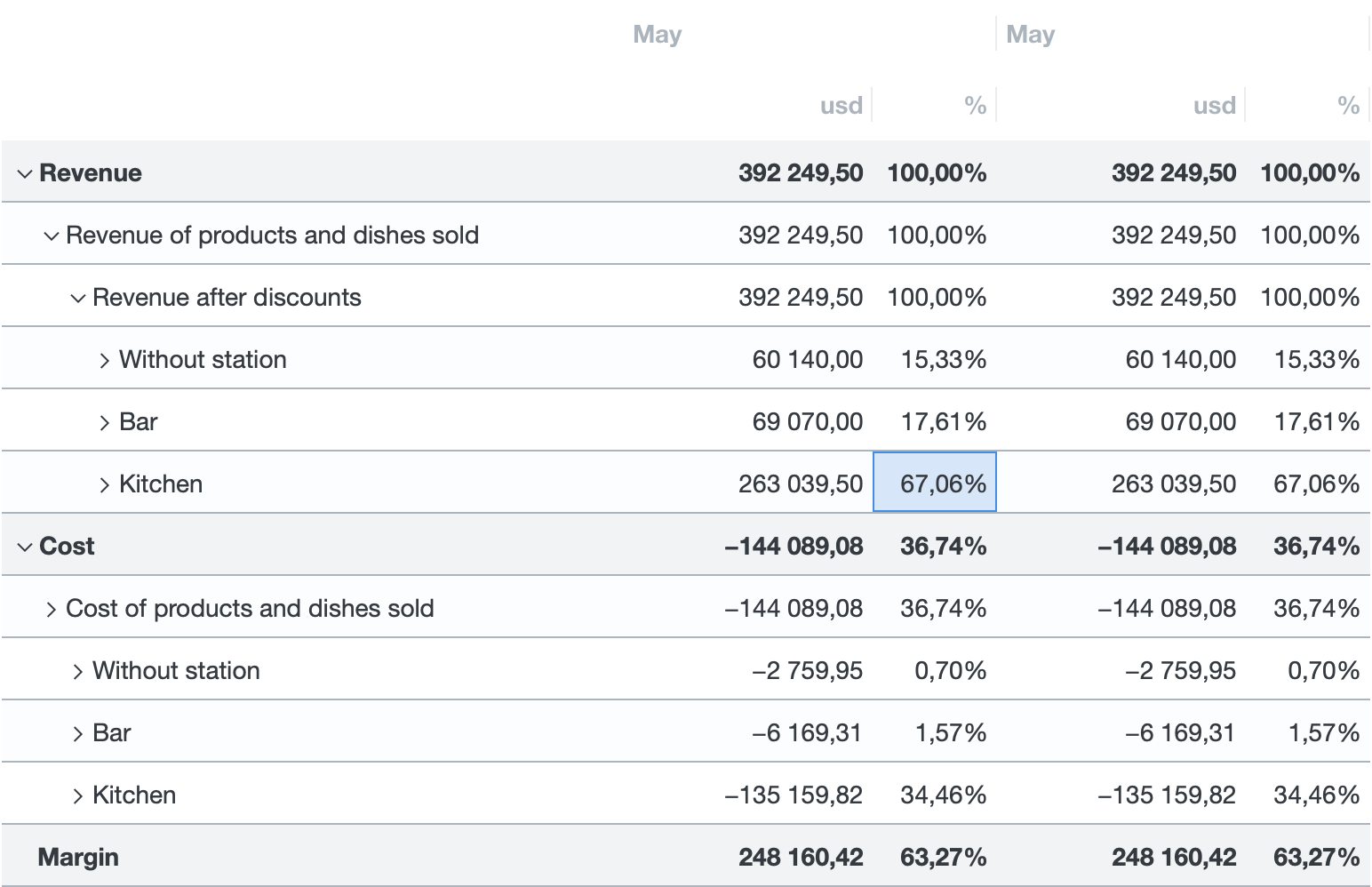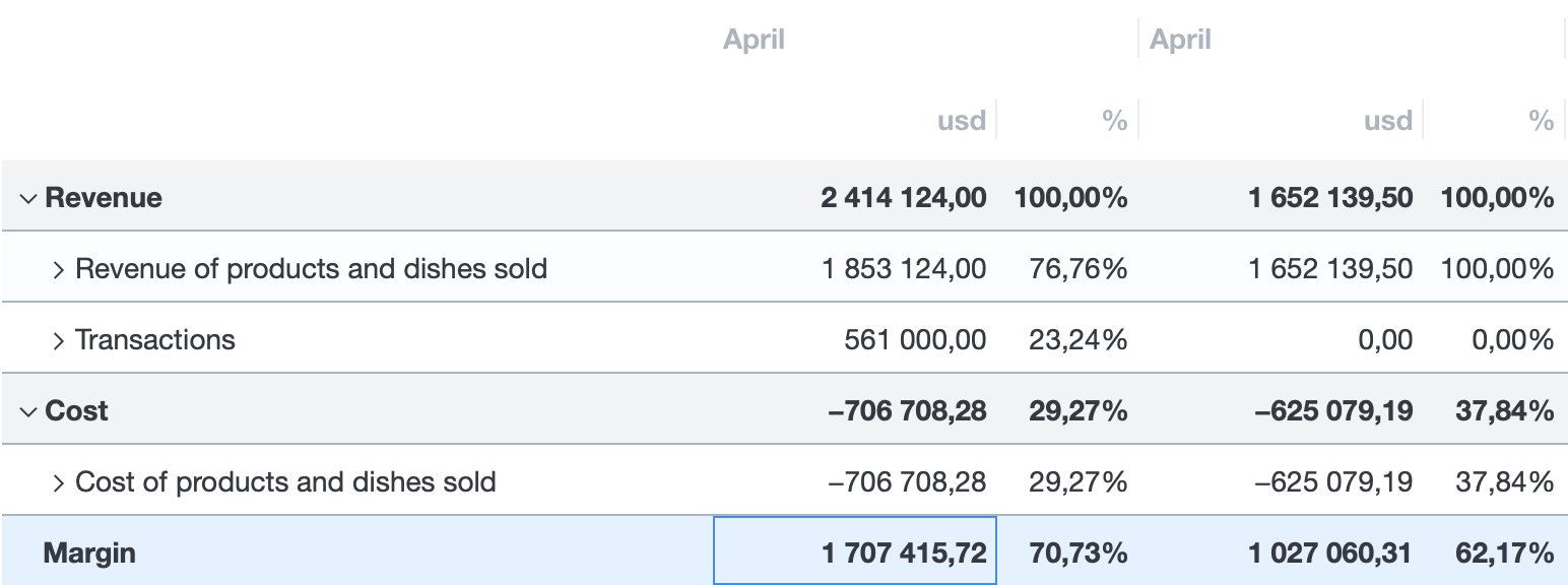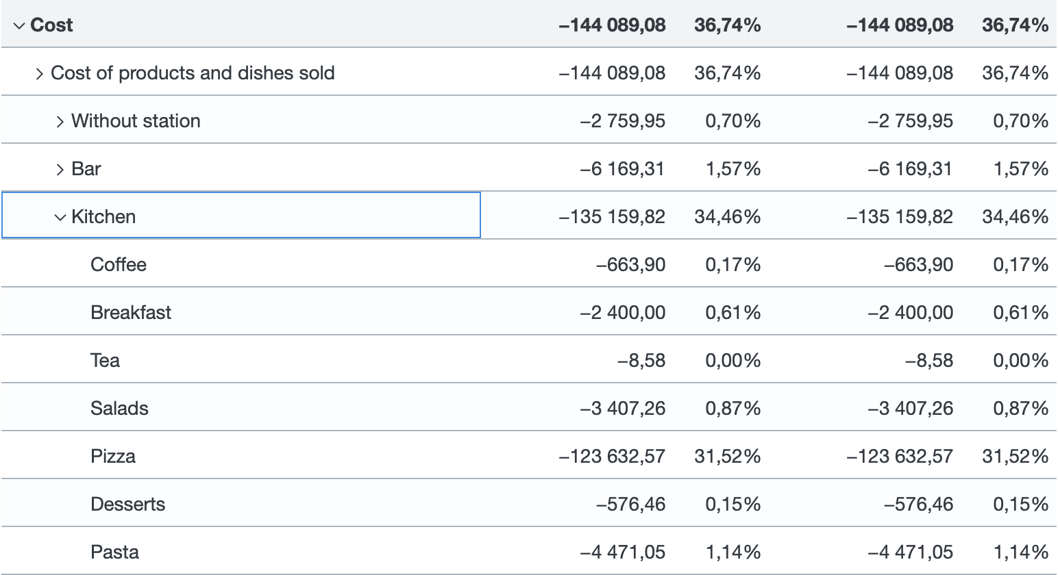 The report automatically populates with sales data from the register and the cost of sold dishes. It also includes all transactions added in the management console. You continue to enter all expenses and income into Poster, and Poster will categorize and display it in a clear, easy-to-understand format.