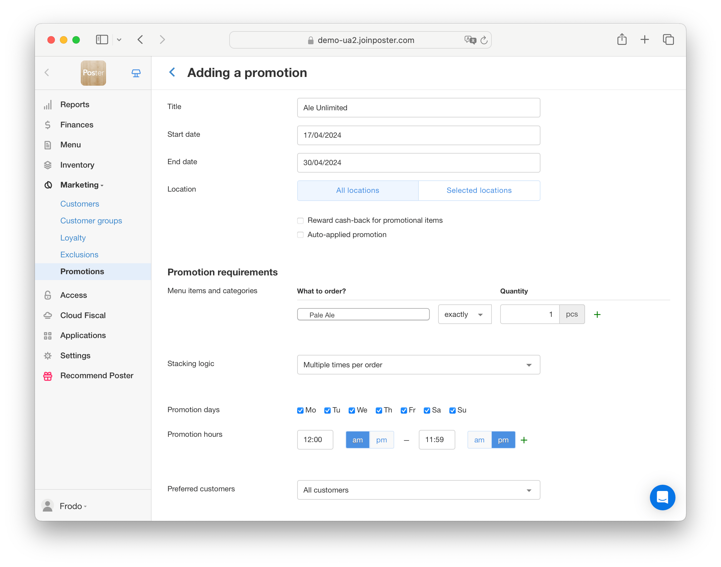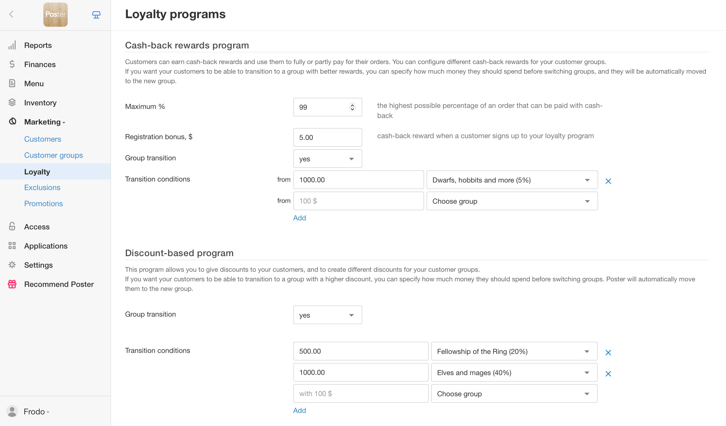 Offer your customers one-time, recurring, or cumulative discounts and cash-back. Poster’s promo and loyalty program tools make it easy.