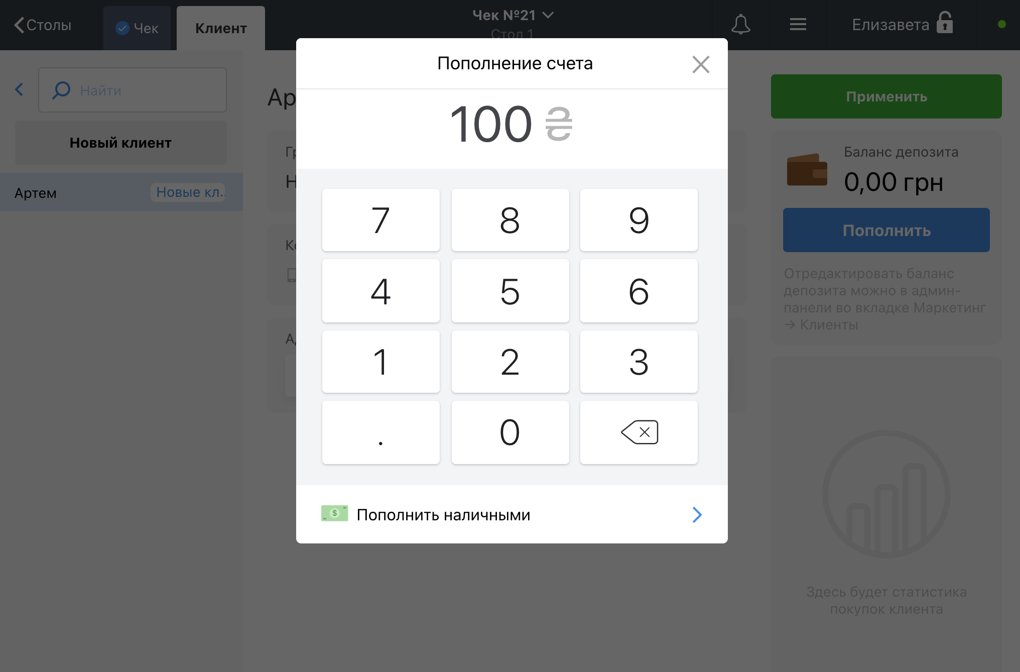 - Напишите сумму, которая будет зачислена на счет гостя, нажмите Пополнить наличными и внесите деньги в кэшбокс. Poster добавит прибыльную транзакцию к кассовому изменению.