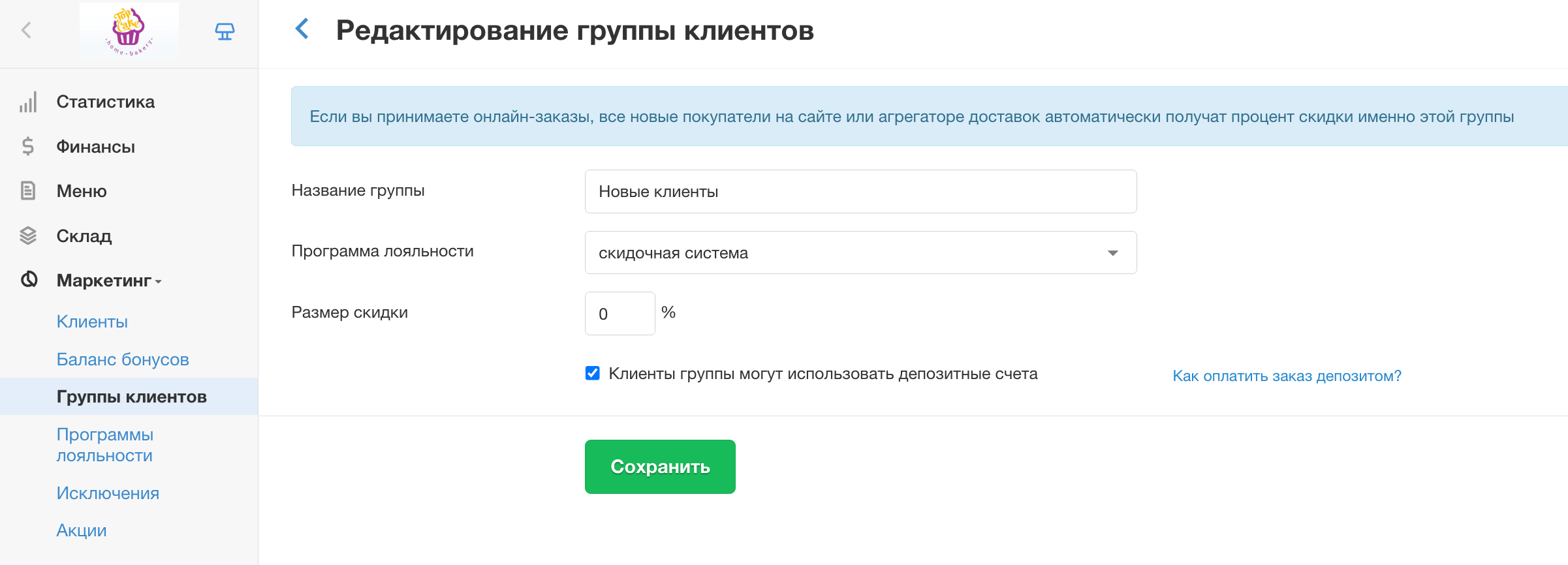- Поставьте галочку в пункте Клиенты группы могут использовать депозитные счета.