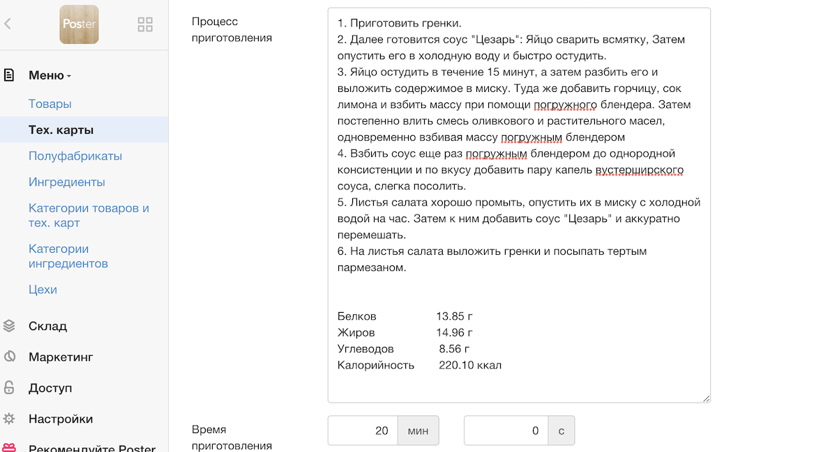 В программе для кафе Poster удобно указывать калорийность блюда, чтобы эти данные были всегда под рукой. После того, как вы рассчитали КБЖУ в калькуляторе калорий, добавьте их в описании способа приготовления в тех. карте. Настройте вывод данных о калорийности в QR меню .