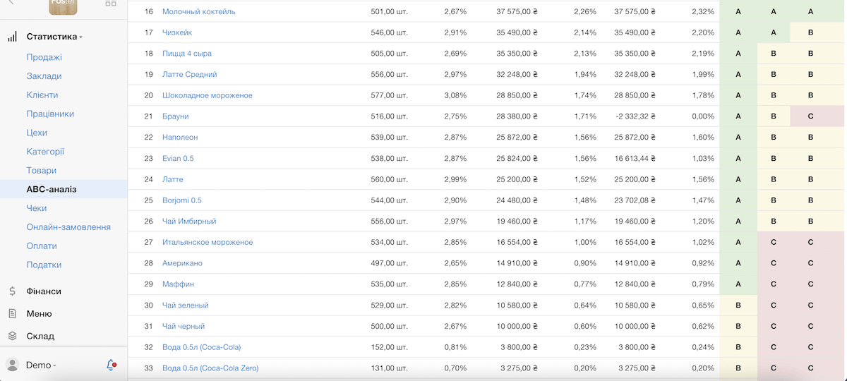 В системе автоматизации кафе Poster категория «ААА» — товары и блюда с низким фудкостом, которые приносят больше всего прибыли и часто продаются. Товары из категории «АВВ» продаются часто, но выручка и прибыль от них меньше. Категория «АСС» — напитки, которые хорошо продаются, но совсем не выгодны для кафе.