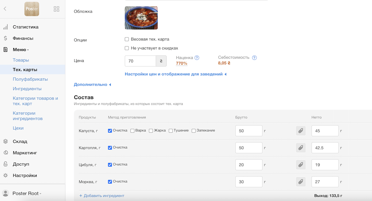 При создании тех. карты и полуфабриката в программе автоматизации ресторана Poster с весовыми ингредиентами, укажите для них брутто и нетто вручную или используйте автоматический расчет процентов потерь.
