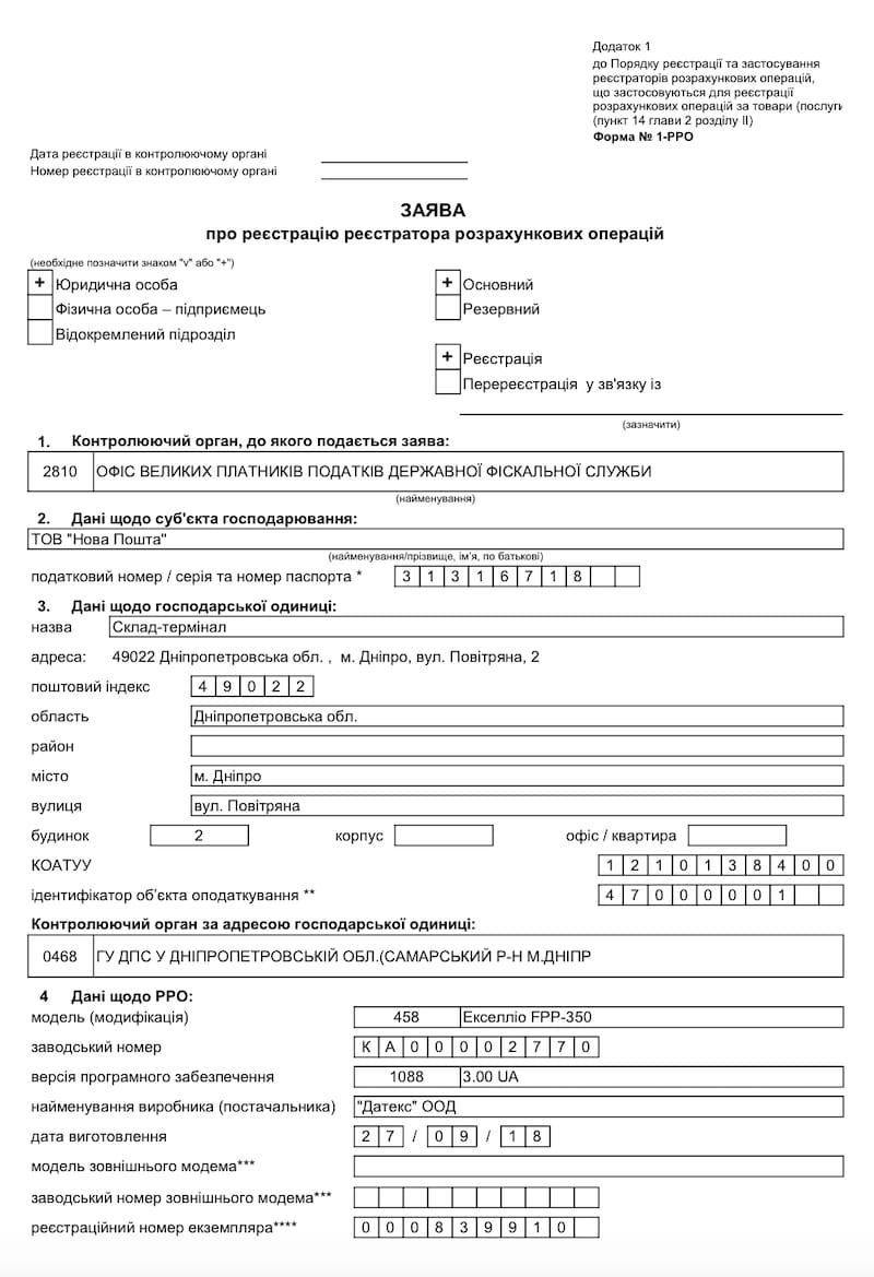 Скачать пример заявления о регистрации РРО