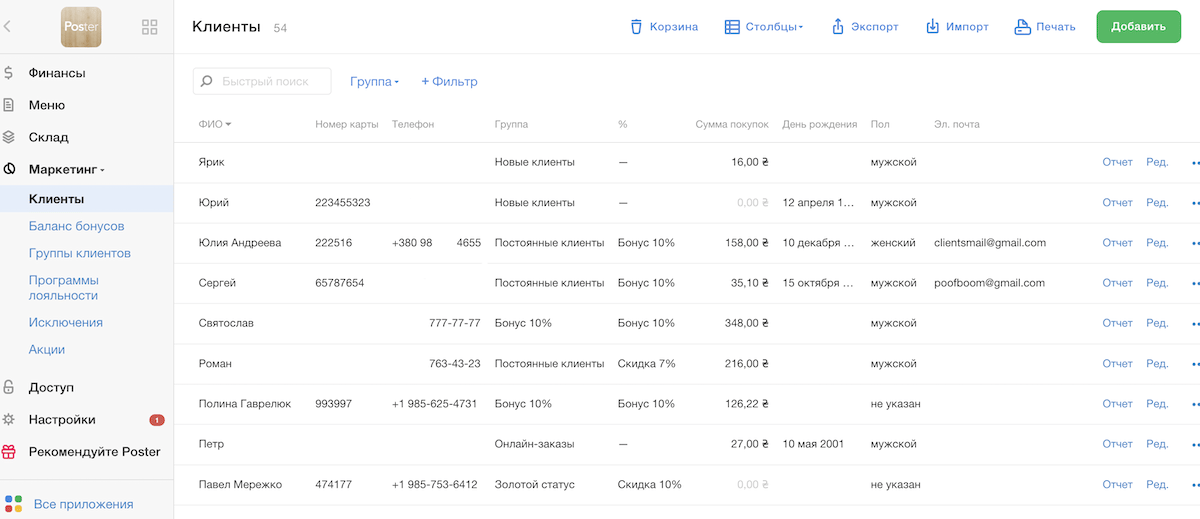 Poster — облачная программа для ресторана , в которой есть встроенная CRM. С Poster вы сможете вести учет в кафе и совмещать с ведением клиентской базы. Основные преимущества CRM системы в Poster:
