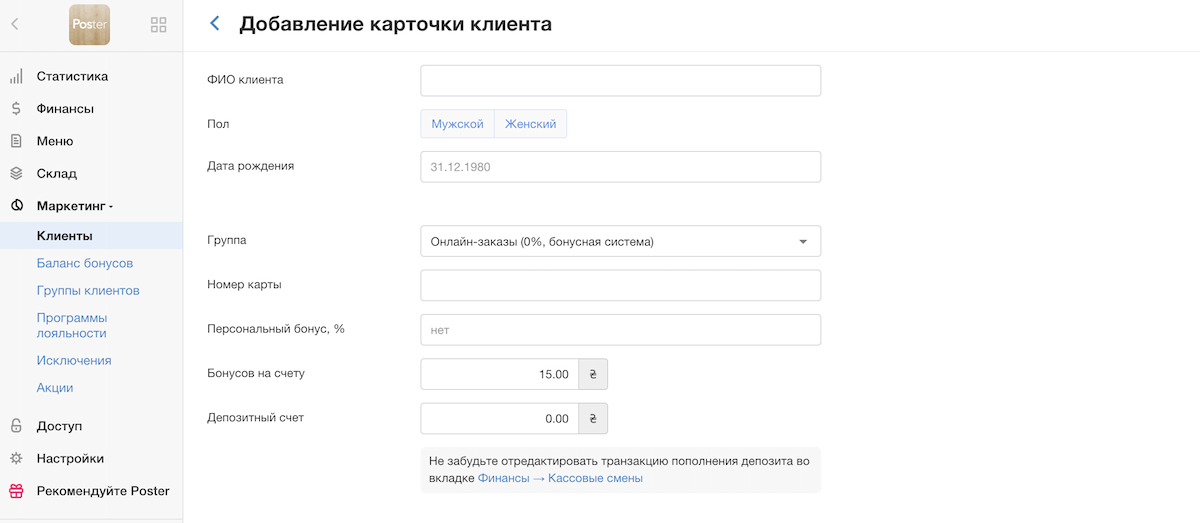 Чтобы упростить создание базы гостей, используйте специальные программы. В программе для учета в кафе Poster можно удобно и быстро создать карточку гостя со всей полной информацией о нем. Так вы можете заполнить номер телефона, электронную почту для рассылок. А также можно добавить дату рождения гостя, чтобы делать персональные предложения и скидки в день рождения.