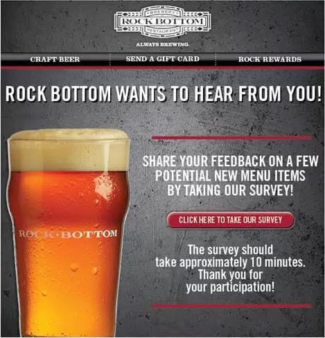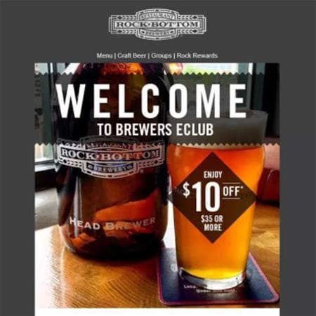 Вот пример от американского пивного ресторана Rock Bottom, где подписчикам обещают присылать новости и скидки. Это отличный повод для клиента в будущем открывать письма в поисках интересной акции или специального предложения.