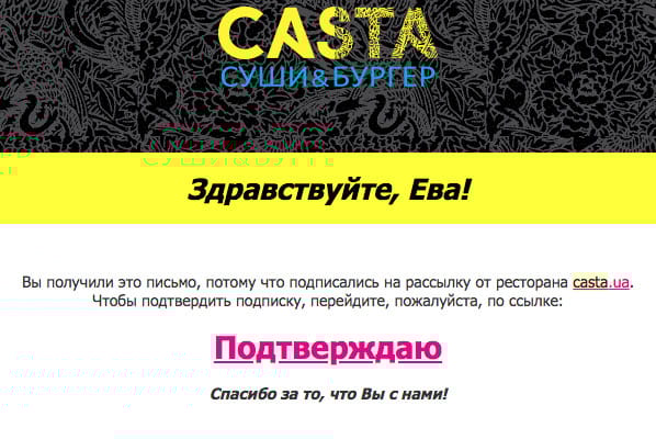 Главная функция такого письма — чтобы пользователь подтвердил корректность своего почтового адреса и желание получать от вас рассылки. Именно с него начинается формирование имиджа вашего заведения в глазах клиента.