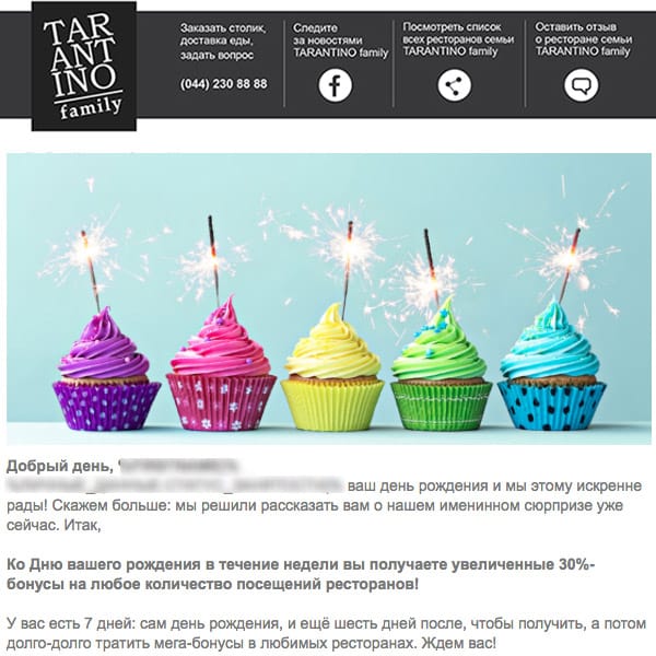 Такие письма нужно делать максимально личными. Например, в поздравлении с днем рожденья не только обратиться по имени, но и предложить скидку на любимое блюдо.