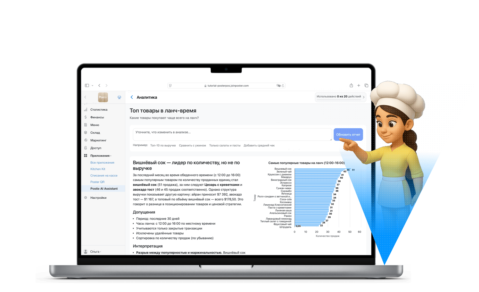 - Аналитика меню на основе данных о продажах подсказывает, какие позиции продвигать, изменять или убирать, и как лучше выстроить структуру меню.