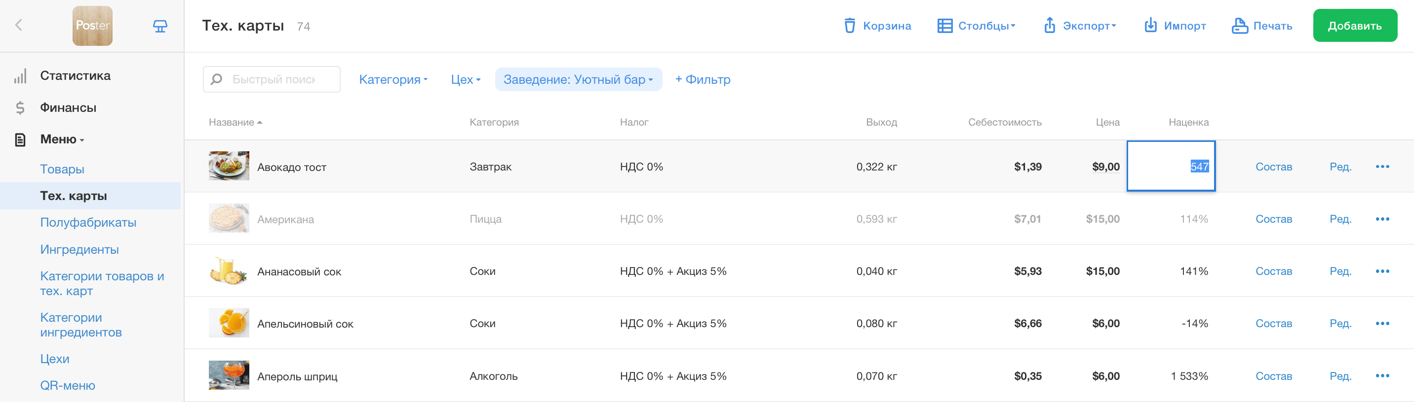 Не забудьте учесть цены конкурентов в вашем сегменте. Если вы новое заведение, цена должна быть конкурентной, но не слишком низкой, потому что это может сигнализировать о низком качестве продуктов или сервиса. Также устанавливайте наценку для любой категории меню одним кликом и отслеживайте рентабельность блюд в режиме реального времени. Например, в одних заведениях блюда бранча могут иметь наценку 120–180%, а в кофейнях — от 200%, но всё зависит от подходов к ведению бизнеса.