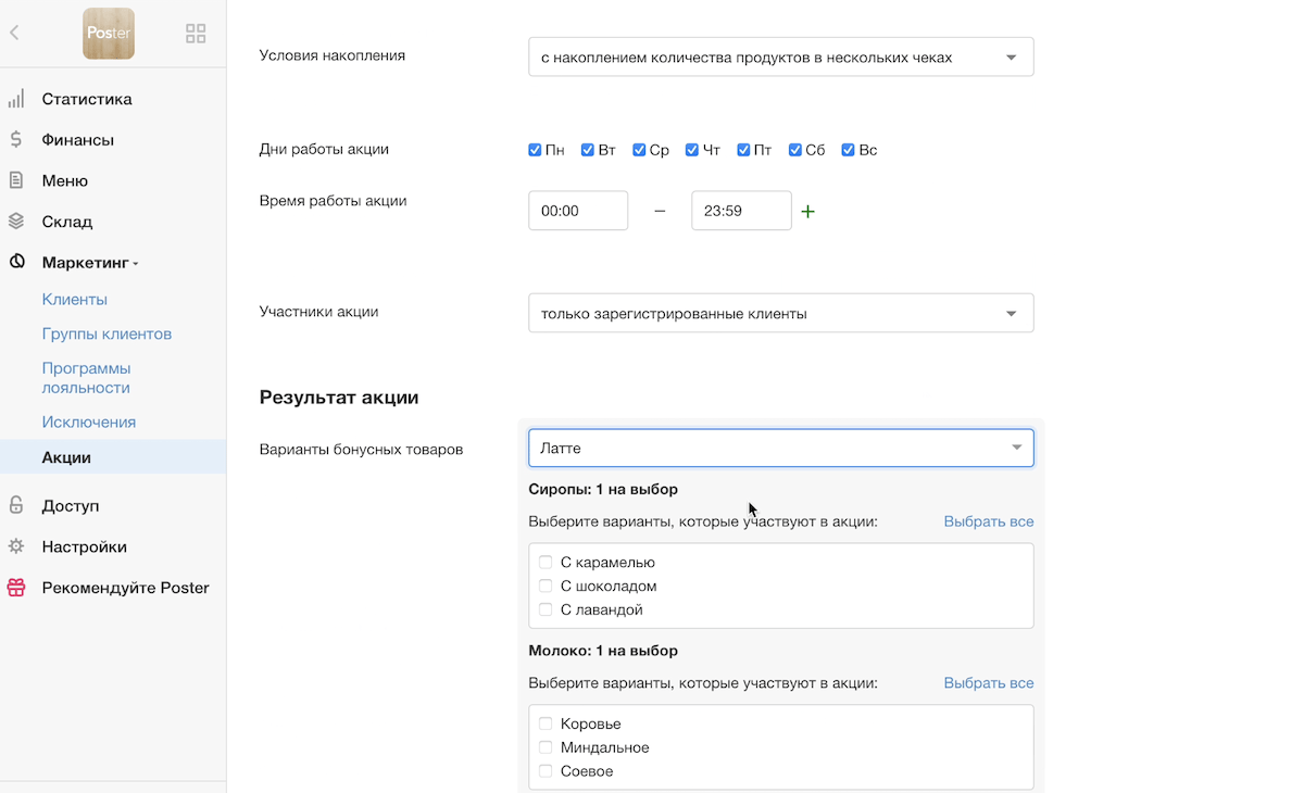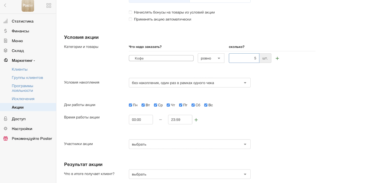 Запустите популярную акцию «6-я чашка кофе в подарок» в своей кофейне в пару кликов. Для этого воспользуйтесь конструктором акций в Poster. Добавьте условия акции и выберите категории напитков, которые участвуют в акции.