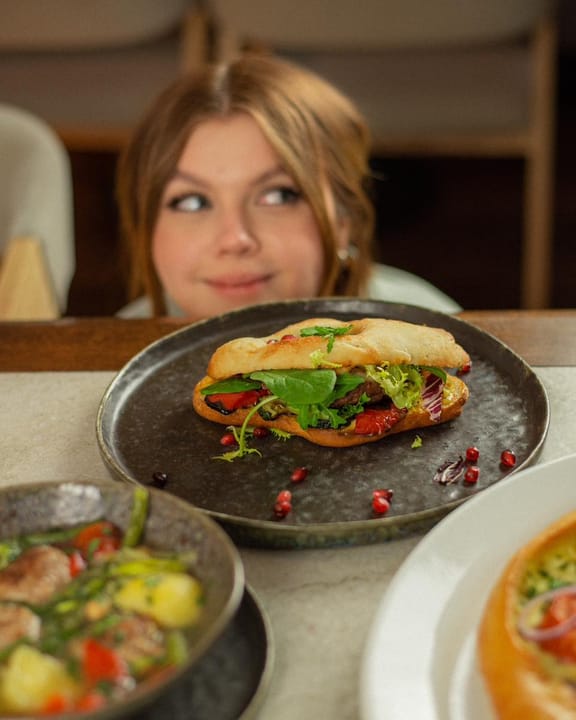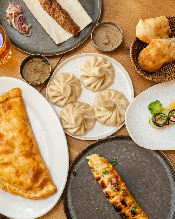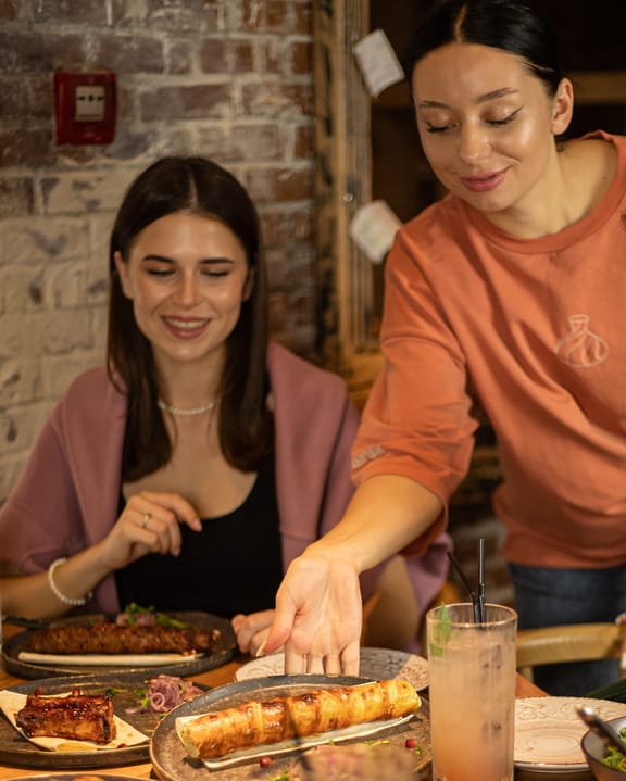 Что звучало: “Мы здесь. Хинкали здесь. Хачапури здесь. Сочный шашлык здесь. Долма здесь. Akhali - грузинская кухня здесь”.