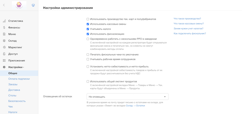 Теперь перейдем к настройке налогово в Poster. Сперва понадобится включить работу с фискализацией и учетом налогов в общих настройках.