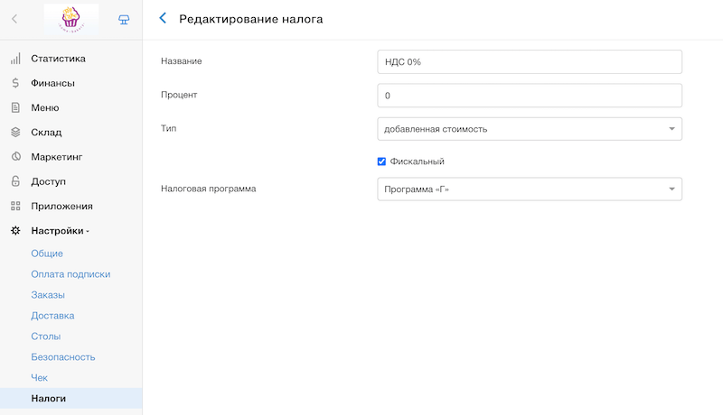 Следом создайте новый налог или выберите налог из уже существующих во вкладке Настройки → Налоги. Тут укажите, что налог будет фискальным, то есть информация о проданных товарах с этим налогом будет передаваться в налоговую, и привяжите соответствующую букву.