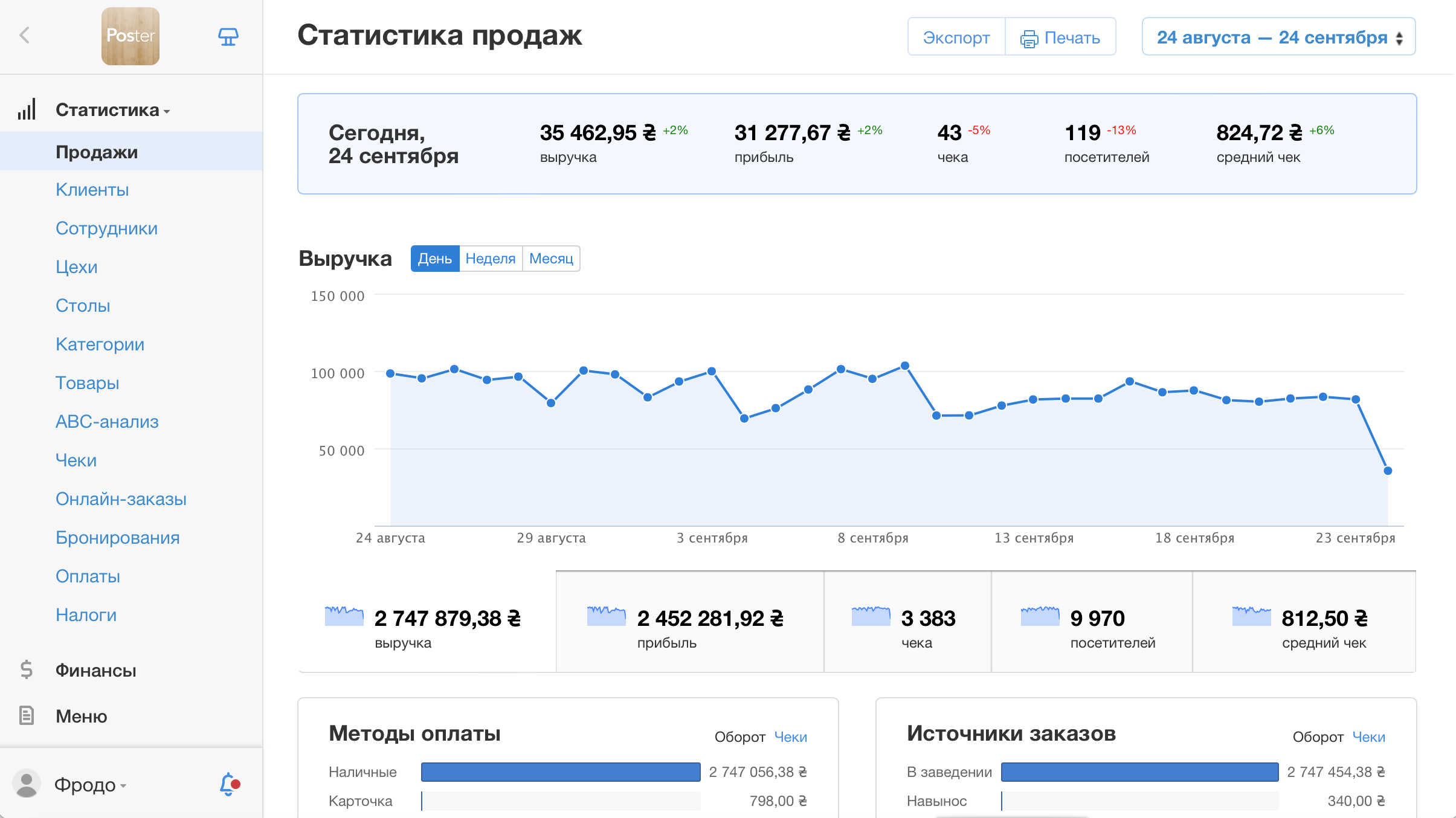 Будьте в курсе каждого аспекта вашего бизнеса с детальной аналитикой от Poster, которая обновляется в режиме реального времени. Все данные о продажах сохраняются в безопасном облачном хранилище и доступны в браузере в любом месте и в любое время.