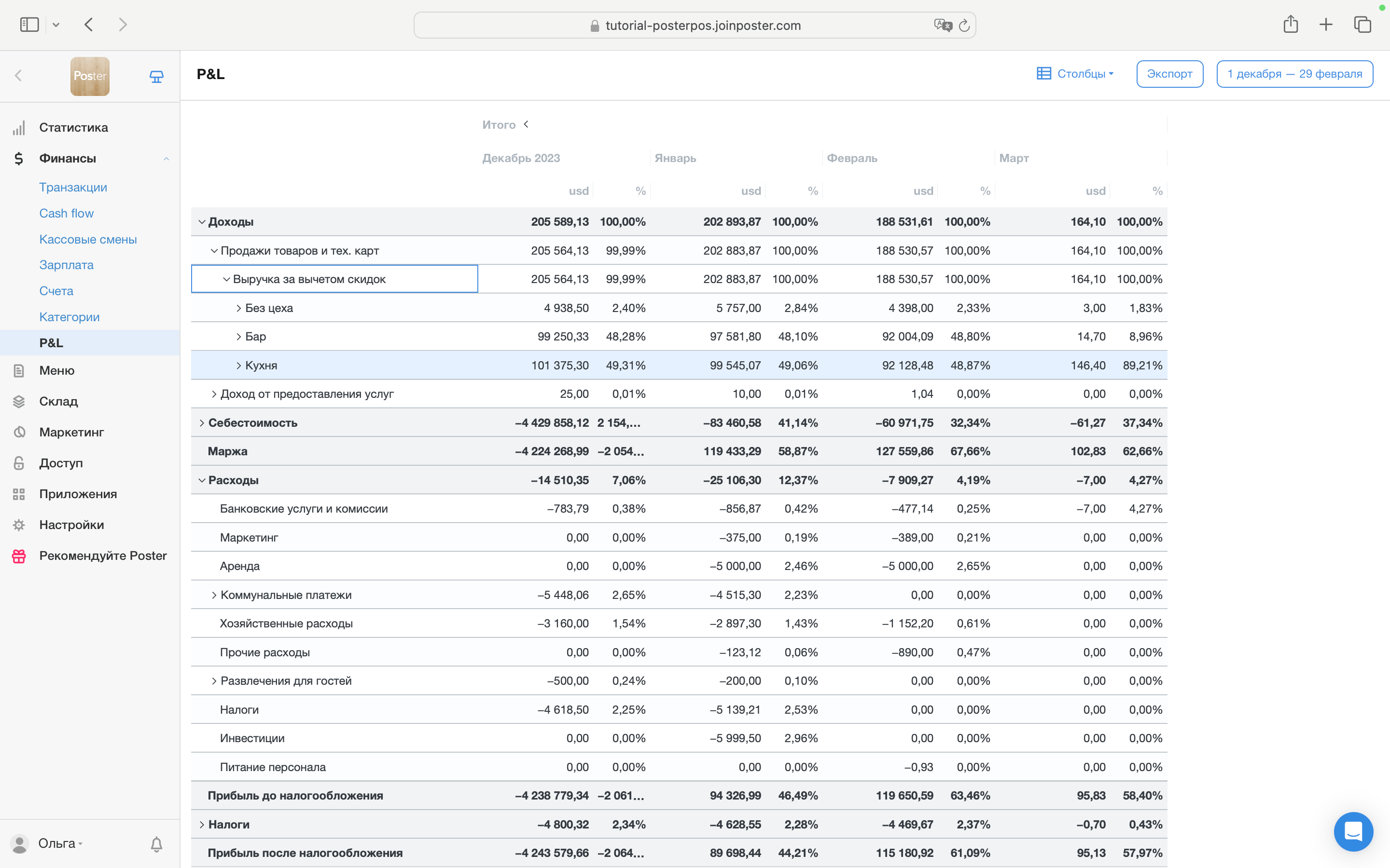 Расширьте возможности аналитики с управленческим учётом от Poster. Добавляйте поставки и другие расходы, Poster учтёт продажи и списания за выбранный период и построит Cash flow и P&L по каждому заведению в аккаунте.