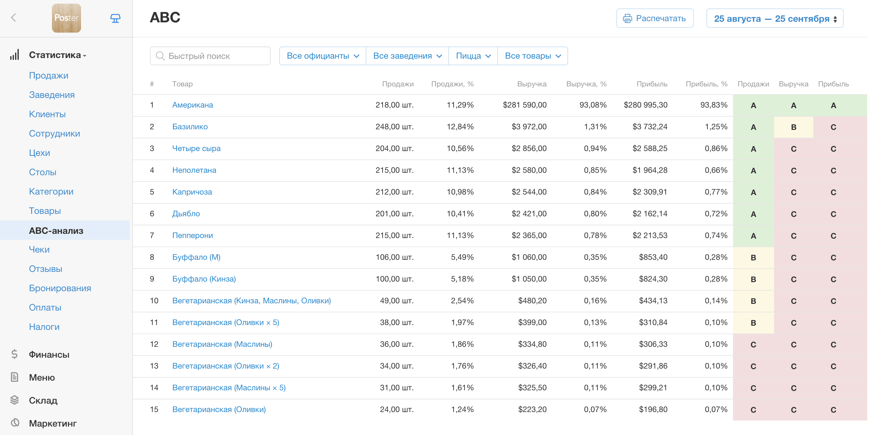 Управляйте меню, опираясь на данные. ABC-анализ оценит ваши продажи и присвоит категории блюдам в соответствии с их популярностью у гостей, процентом выручки и прибылью. Такое наглядное распределение блюд поможет критически оценить меню и качественно управлять им — повышать цены, вводить и выводить блюда, внедрять промоакции и даже планировать закупки.