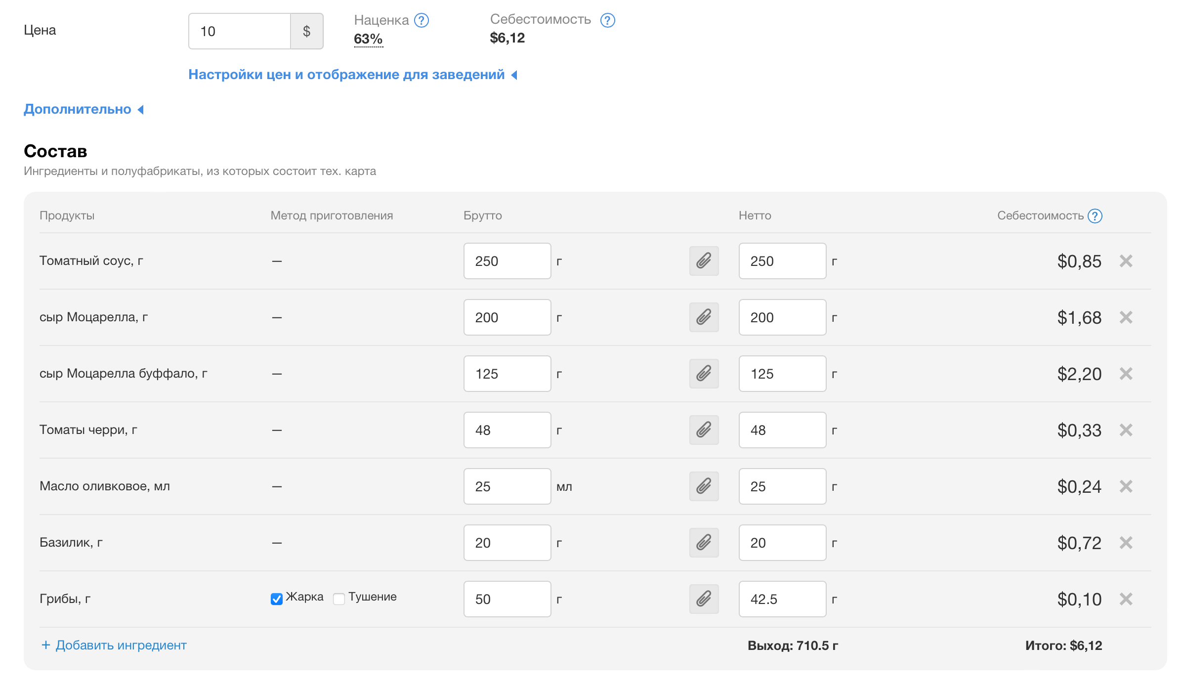 Себестоимость тех. карт рассчитывается автоматически с учетом поставок ингредиентов и остатков на складе. Себестоимость будет пересчитываться после каждой новой поставки.