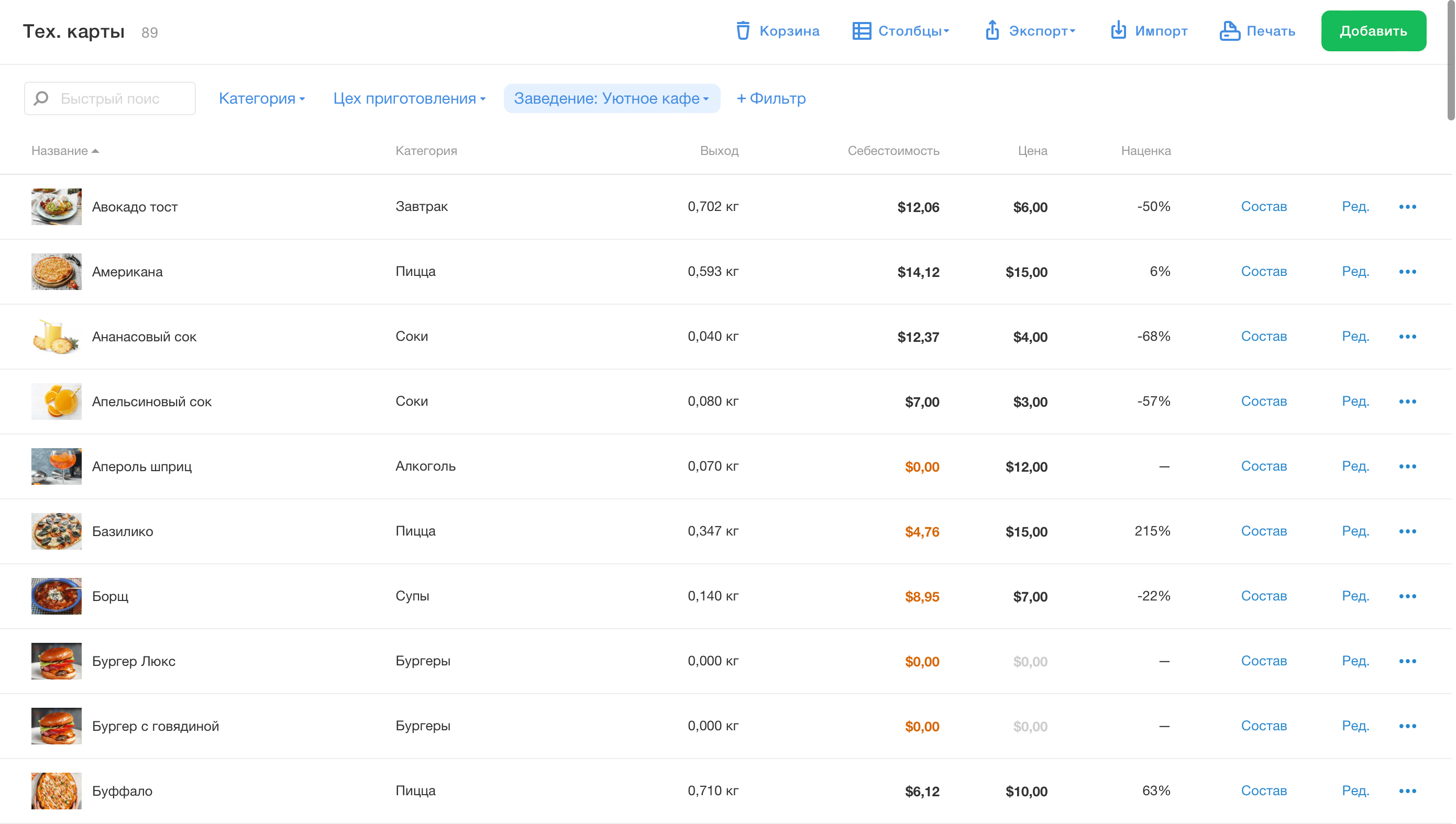 Посмотреть текущую себестоимость моих ингредиентов, блюд и полуфабрикатов?