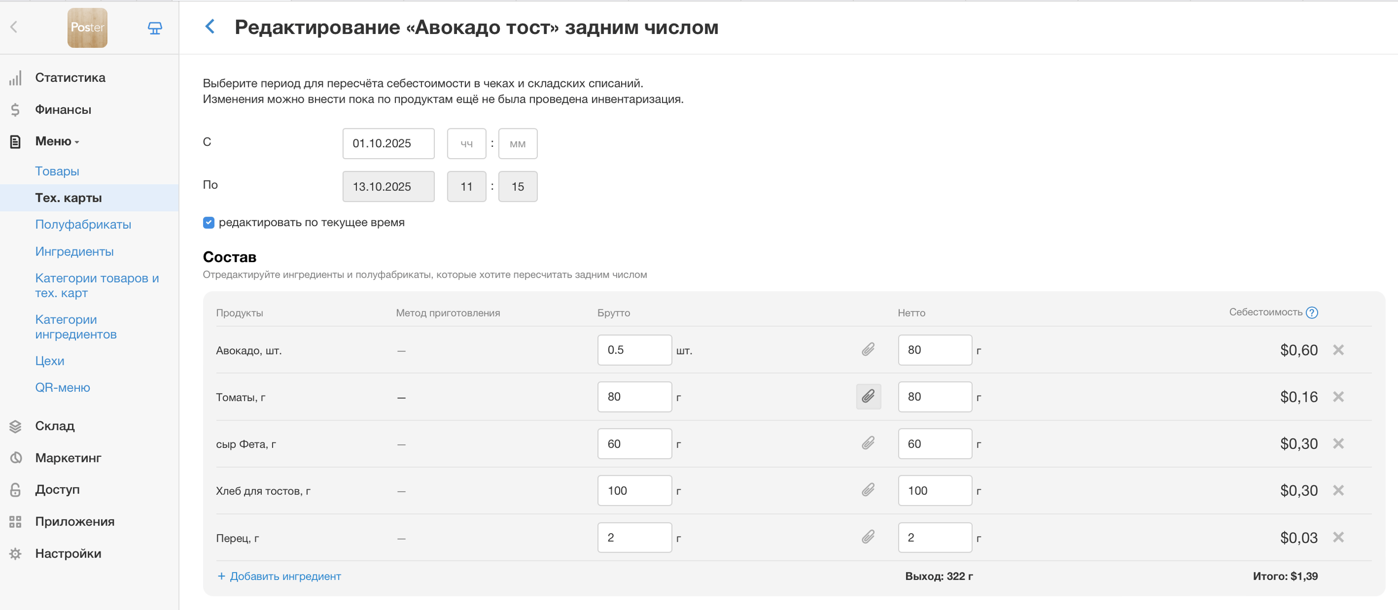 Не успели заполнить тех. карты ингредиентами и уже начали продажи? Или начали готовить блюдо с обновлённым составом и не успели внести это в систему? Отредактируйте тех. карту задним числом и исправьте списание ингредиентов в несколько кликов.