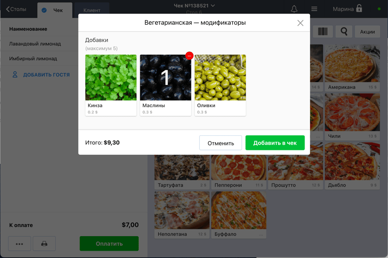 Организуйте меню и зарабатывайте больше с модификаторами тех. карт. Предлагайте гостям разные топпинги для пиццы, степень прожарки стейка или соусы к нему – с модификаторами официант быстро примет любой такой заказ.