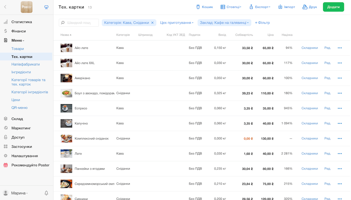 Додайте до системи автоматизації Poster меню вашого закладу . Створіть товари, тех. картки, інгредієнти та напівфабрикати. Це спростить процес оновлення меню, дозволить зберігати історію редагувань страв та допоможе контролювати наявність продуктів.