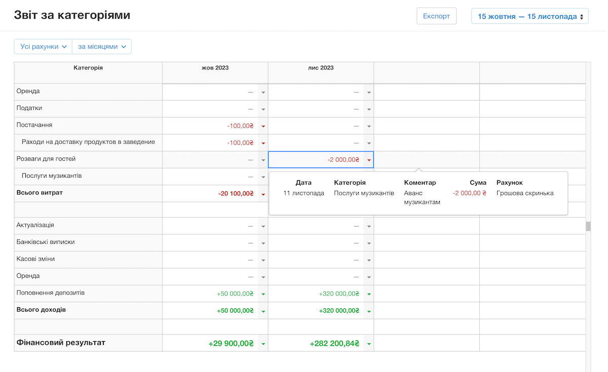 Вносьте до системи автоматизації всі витрати та доходи, щоб формувати фінансовий звіт , бачити повний P&L та оцінювати прибутковість вашого закладу, планувати бюджет.