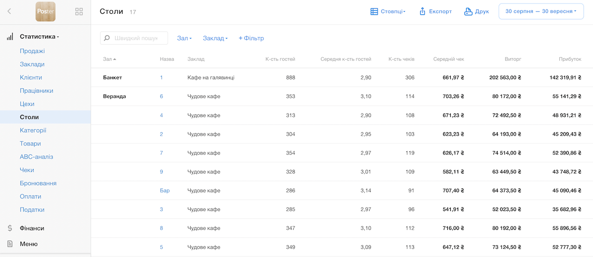 У програмі для автоматизації кафе Poster є аналітика по кожному столу у вашому закладі. Ви зможете подивитися за окремий період виручку по кожному столу, скільки чеків було закрито та скільки гостей було на цю кількість чеків.