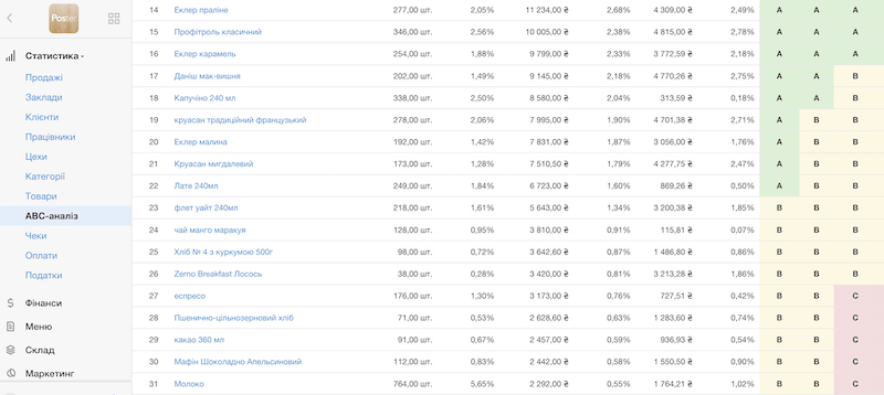 Таким чином ви зможете в меню виділити страви, які мають найбільший попит і прибрати з меню страви, які не приносять виторгу. Цей крок допоможе як підняти виторг кафе, так і оптимізувати меню. У програмі для ресторанів Poster АВС-аналіз працює за тим же принципом і відображає важливість страви для ваших клієнтів.