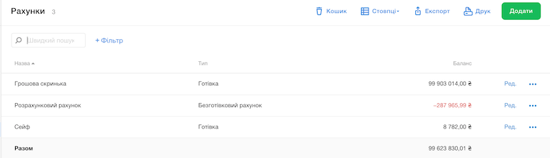 Створюйте в програмі необмежену кількість рахунків. Це допоможе розмежувати надходження коштів з різних джерел. Прив‘яжіть основні рахунки до закладів, щоб транзакції та продажі з каси одразу надходили на них. Наприклад, прив‘яжіть рахунок для безготівкових операцій до закладу та кошти при безготівковому розрахунку на касі автоматично надійдуть на нього після закриття касової зміни.