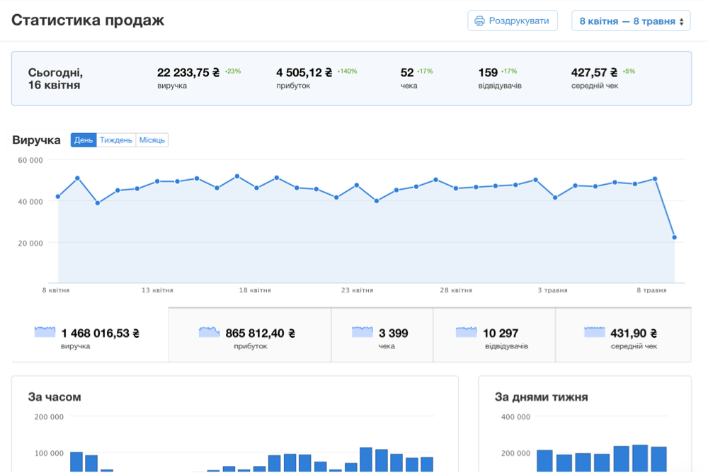 Ви зможете переглядати аналітику кав’ярні по днях тижня, годинах і співробітникам. Аналізуйте динаміку виручки, щоб розуміти, які позиції з меню приносять вам більше прибутку.