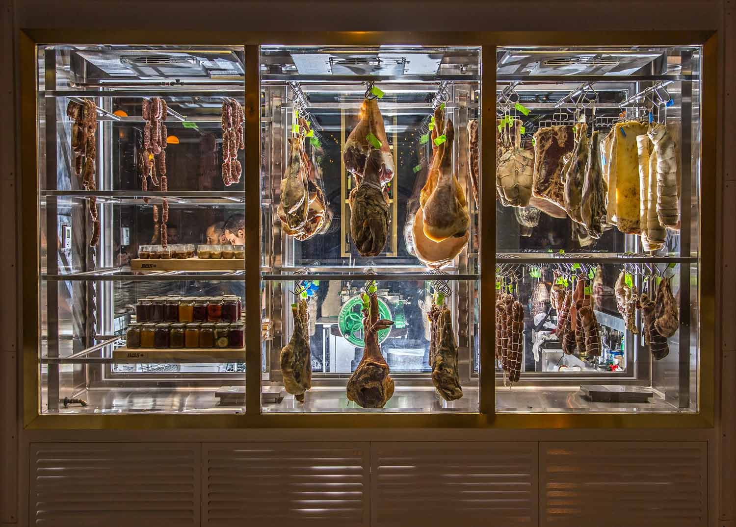 У ресторані зазвичай виділяють різні зони зберігання: комору для сухих продуктів (круп, спецій, консервів), холодильні камери для свіжих продуктів і заготовок, морозильні камери для заморожених інгредієнтів. Також можуть бути окремі сховища для алкоголю, господарського інвентарю та інших специфічних категорій товарів.