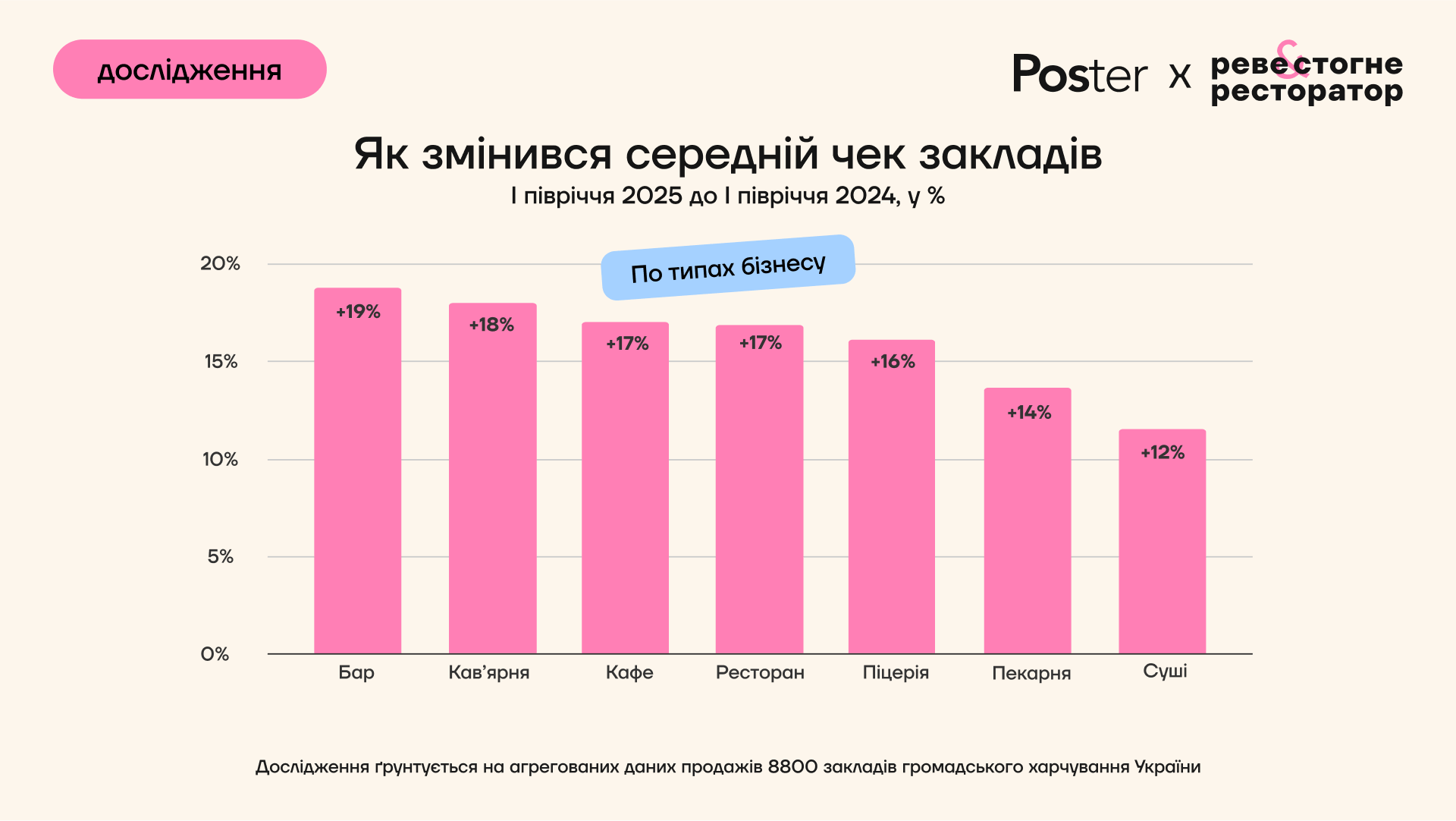 Середній чек у закладах України зріс на 17% і тепер становить 171 грн. Найбільше подорожчали бари (+19%, до 476 грн) та кав’ярні (+18%, до 108 грн). У кафе рахунок зріс до 307 грн (+17%), у ресторанах – до 675 грн (+17%). Середній чек піцерій тепер в середньому 324 грн (+16%), пекарень – 82 грн (+14%), а суші – 670 грн (+12%).