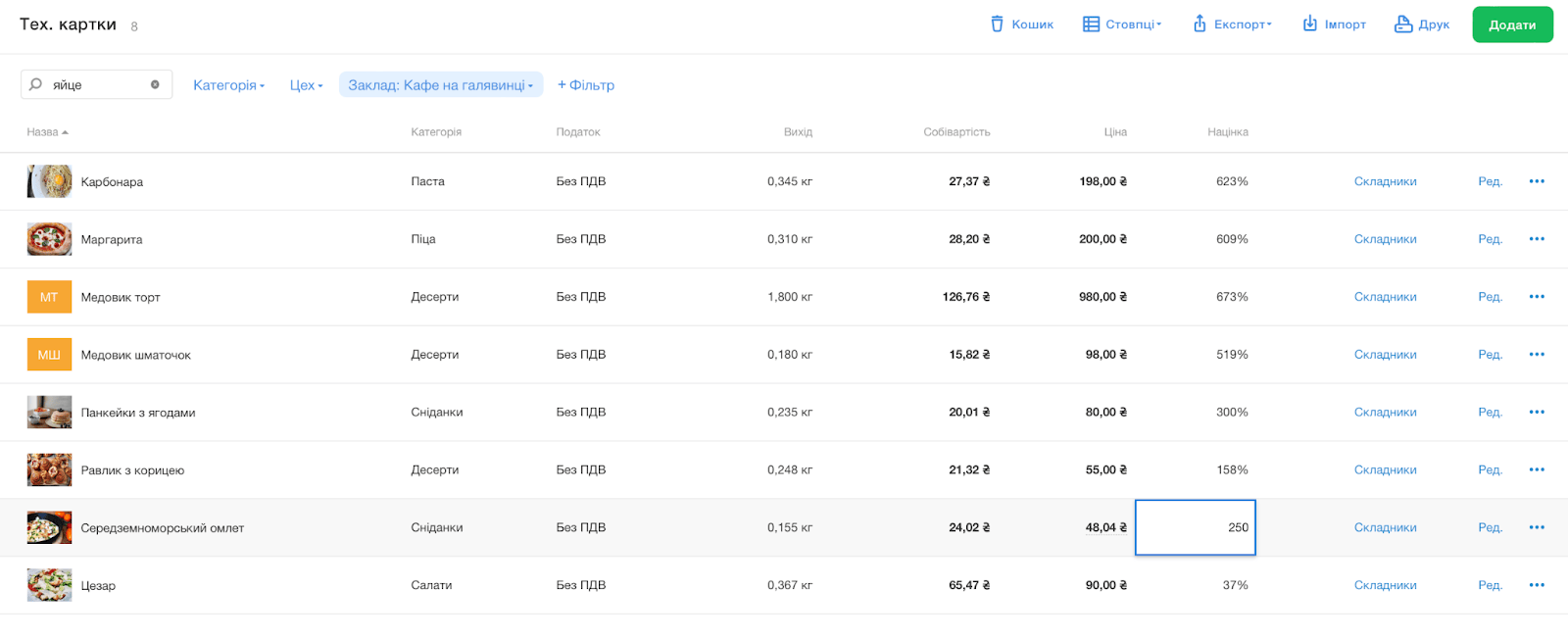 Не забудьте врахувати ціни конкурентів у вашому сегменті. Якщо ви новий заклад, ціна має бути конкурентною, але не занадто низькою, бо це може сигналізувати про низьку якість продуктів або сервісу. Також встановлюйте націнку для будь-якої категорії меню одним кліком і відслідковуйте рентабельність страв у режимі реального часу. Для прикладу, в одних закладах страви бранчу можуть мати націнку у 120–180%, а у кав’ярнях від 200%, але все залежить від підходів до бізнес-діяльності.
