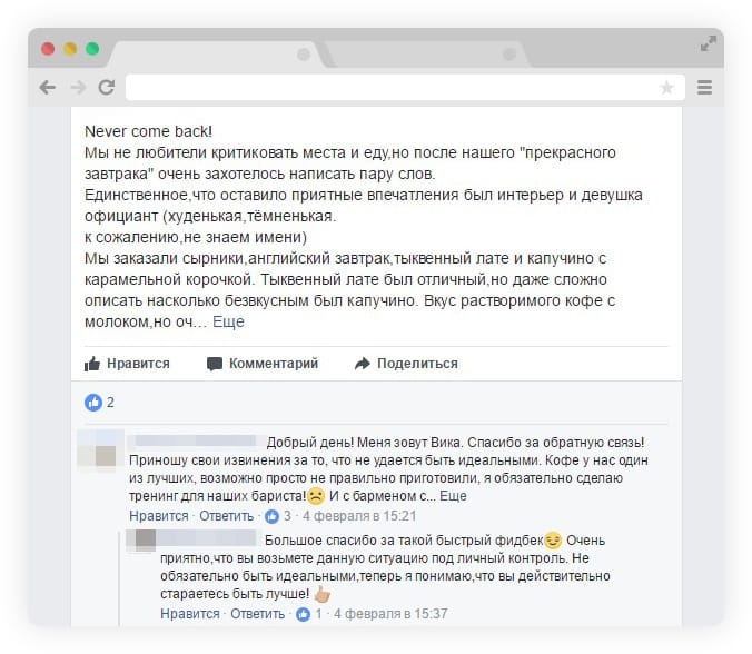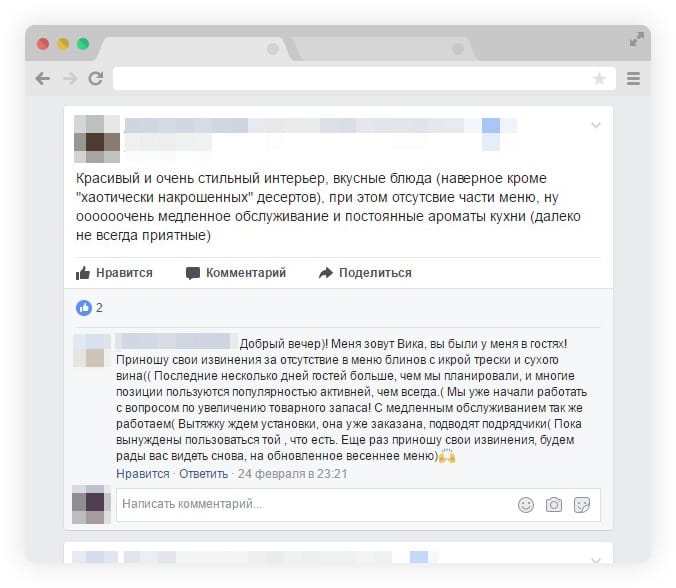 - Не уникайте публічності. Помиляються всі, різне може трапитися: погано обслужив офіціант, не було вільного столика, подали не те, що замовив гість тощо. Цих моментів не уникнути, але відповідати в соціальних мережах за них доведеться вам або вашому маркетологу, піар-менеджеру. Ви маєте взяти на себе всю відповідальність і відповісти на негативний відгук. Публічні визнання дають зрозуміти іншим відвідувачам, що ви готові брати на себе відповідальність, цінуєте їхню думку й час, проведений у вас.