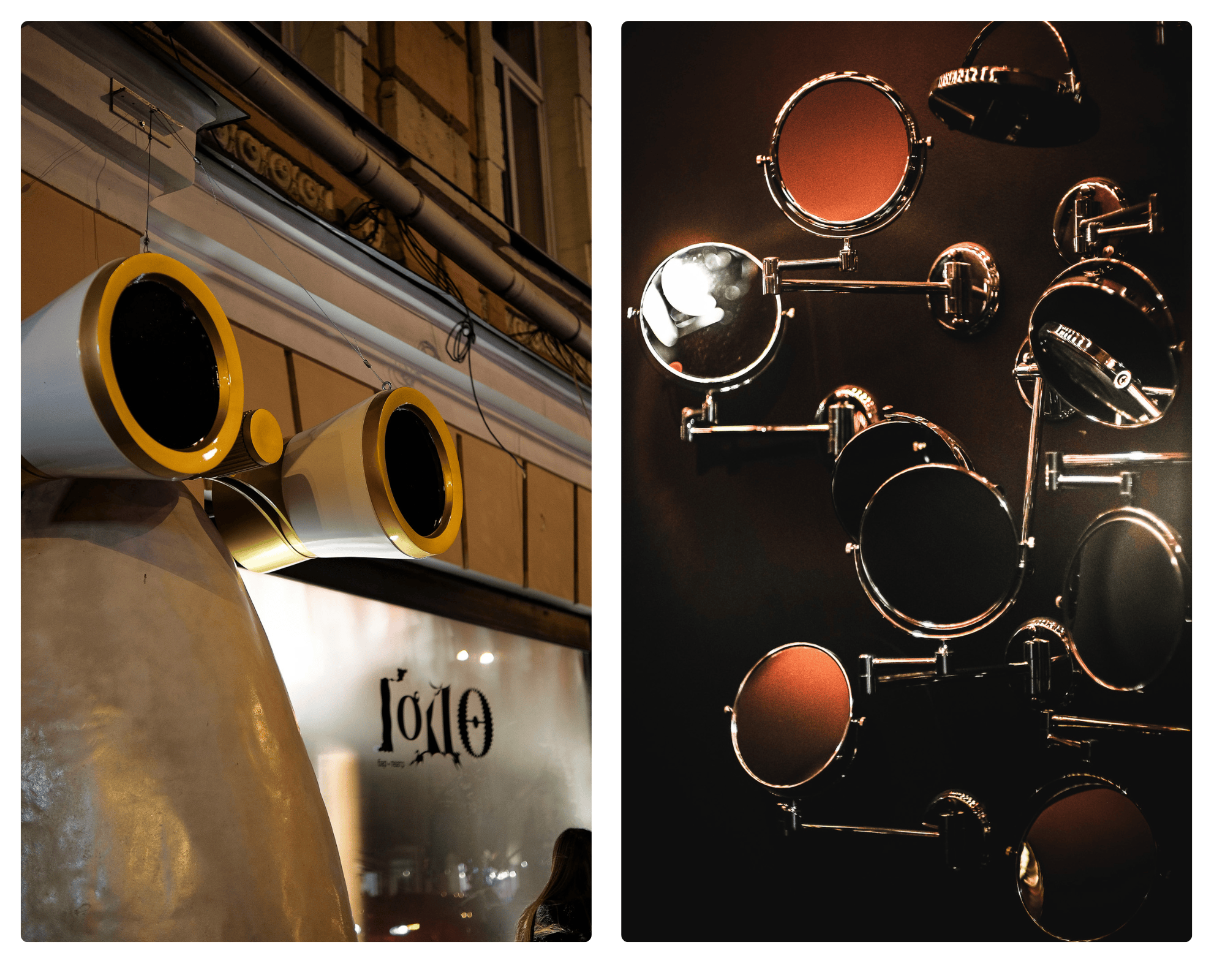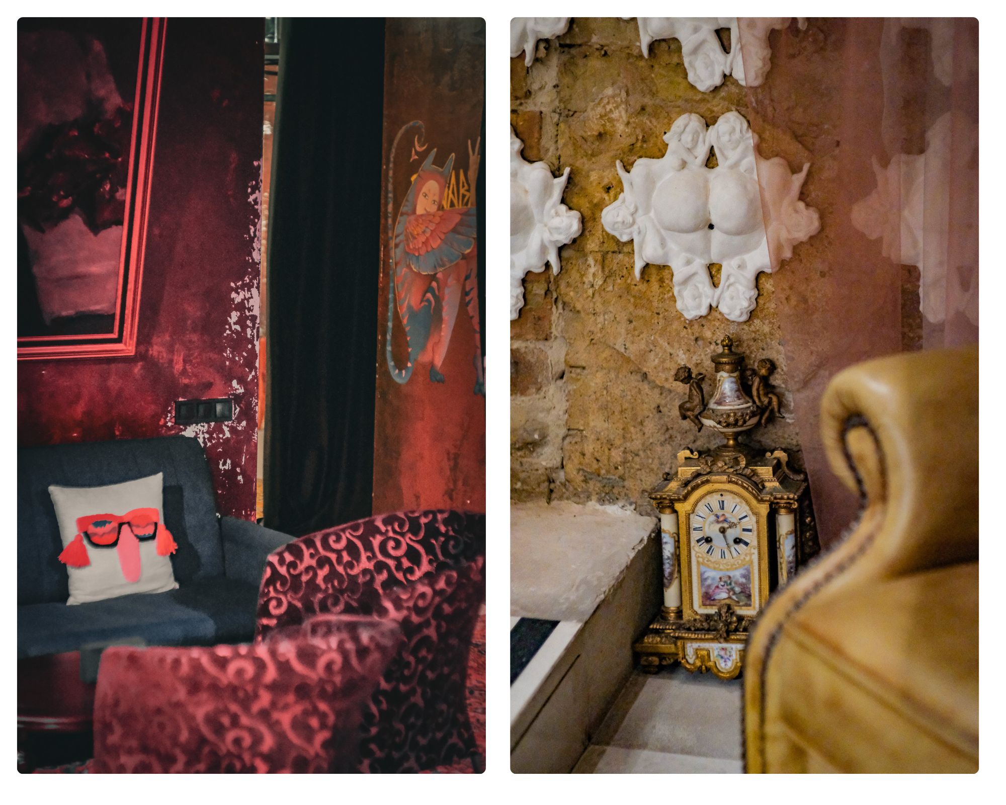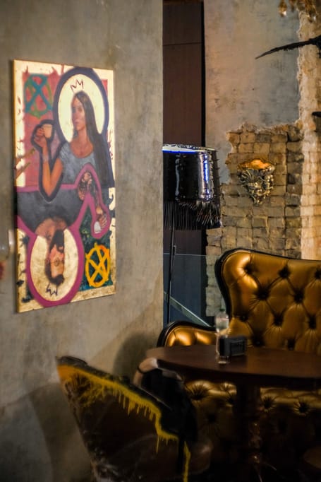Ми придумали історію про салон, куртуазність та театр абсурду. Простір був на початку чорно-білим, а зараз більш театральний, з теплим світлом, яке можна стишувати, доповнювати кольоровими акцентами. Формат бар-театр означає, що на першому поверсі можна випити та поїсти, а на мінус першому в той самий час можуть відбуватися події: вистави, концерти, лекції, майстер-класи.